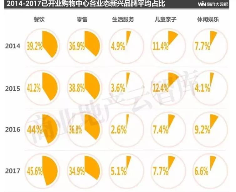ÔÚ2017ÄêпªÒµ¹ºÎïÖÐÐÄÖУ¬ÕûÌåҵ̬ռ±ÈΪ£ºÁãÊÛ52.2%¡¢²ÍÒû28.2%¡¢¶ùͯÇ××Ó11%¡¢ÉúÑÄ·þÎñ5.8%¡¢ÐÝÏÐÓéÀÖ2.8%£»¸÷ҵ̬½ø×¤µÄÐÂÐËÆ·ÅÆÕ¼±ÈΪ£º²ÍÒû46.7%¡¢ÁãÊÛ36.4%¡¢¶ùͯÇ××Ó6.7%¡¢ÉúÑÄ·þÎñ7.3%¡¢ÐÝÏÐÓéÀÖ3%¡£