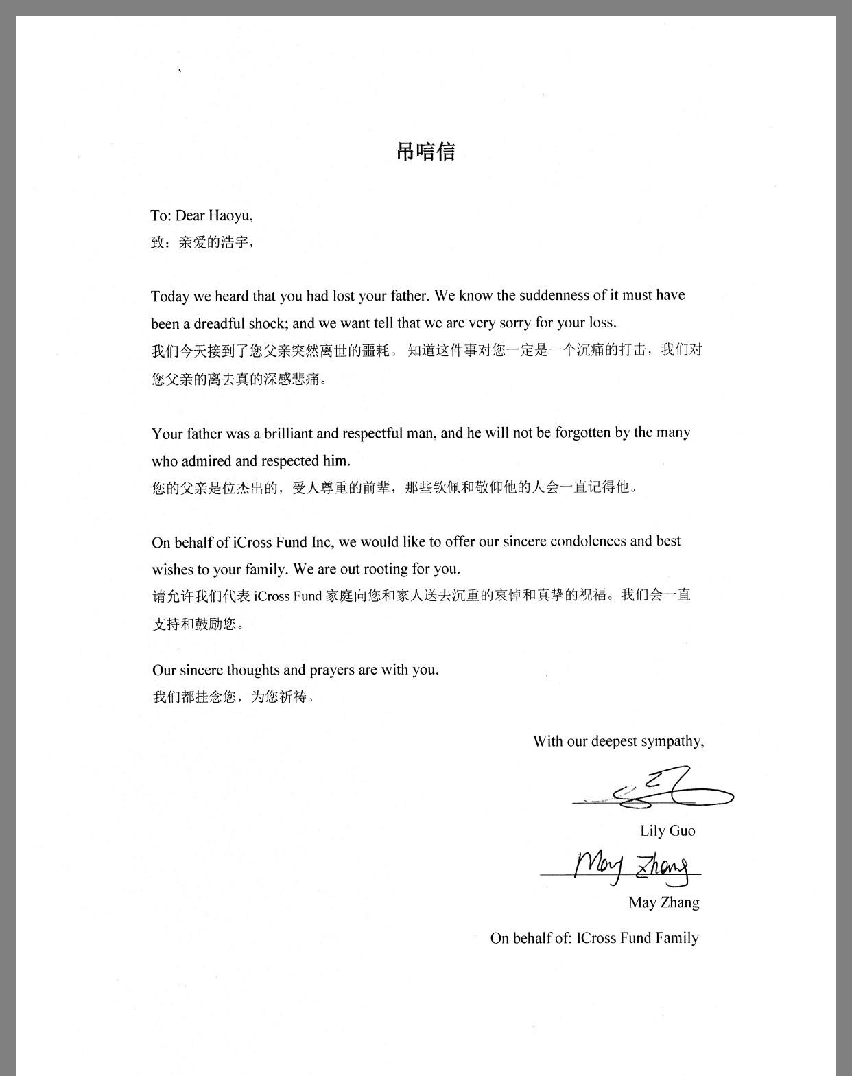 美国Icross金融集团唁电