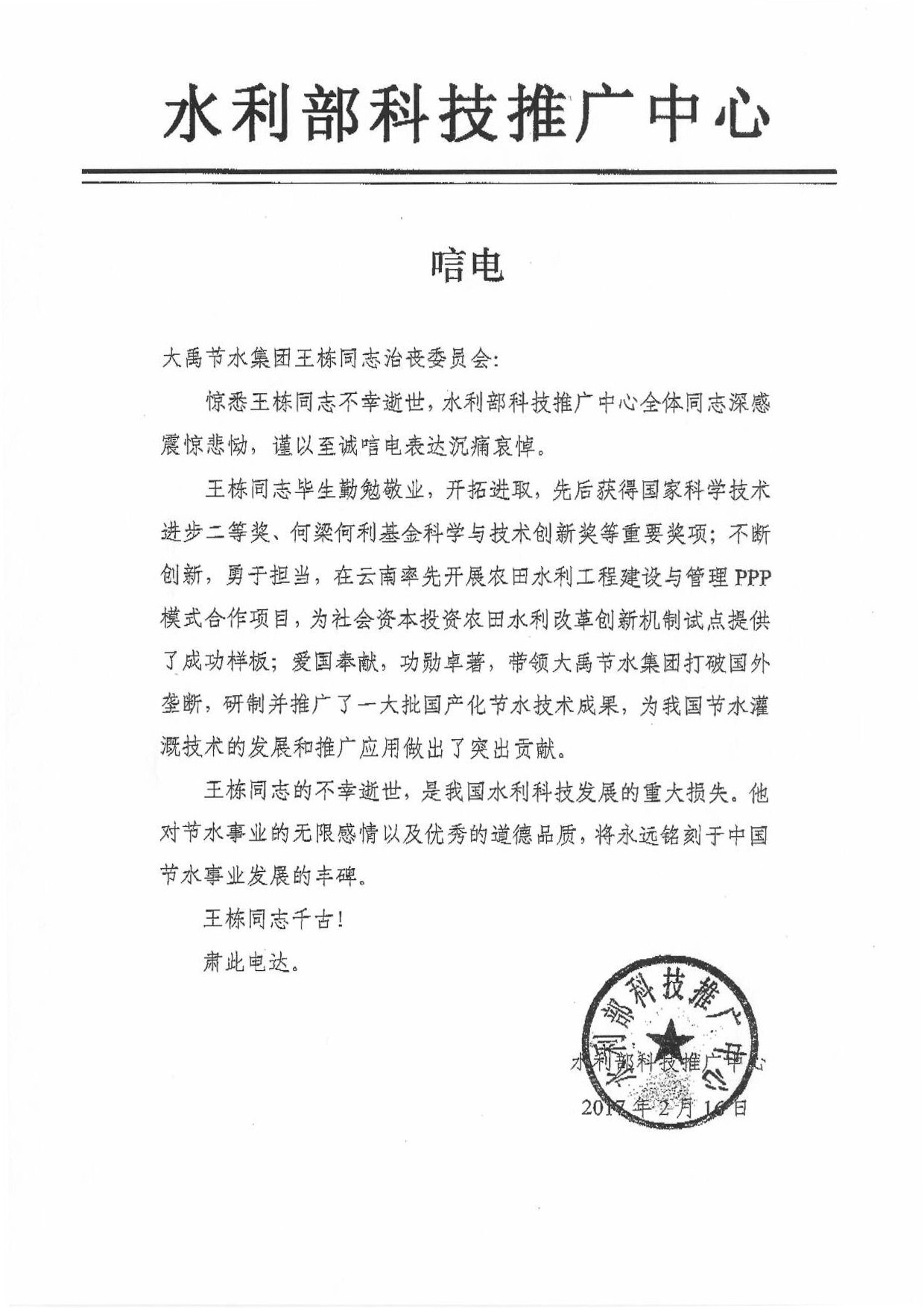 水利部科技推广中心唁电