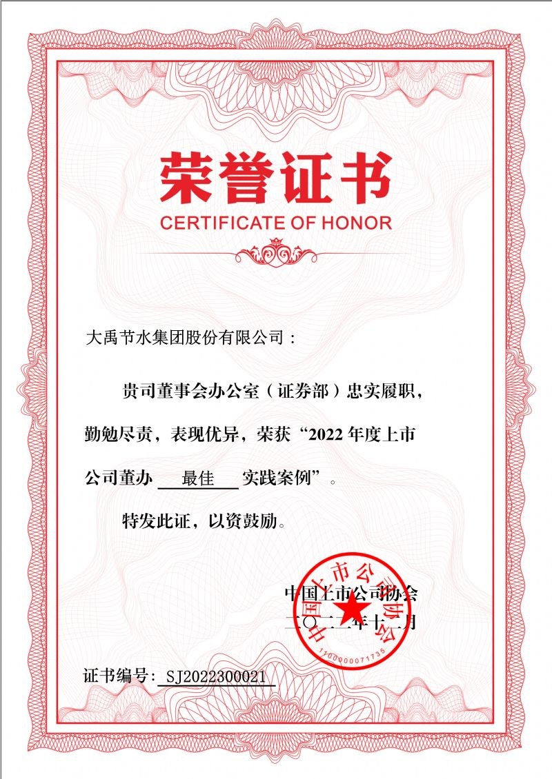 2022年12月16日,中国上市公司协会宣布“2022上市公司董办最佳实践榜单“,公司荣获”2022上市公司董办最佳实践奖“。本次评选运动是中国上市公司协会对上市公司董事会办公室履职情形举行评价。[本次评价运动获得了上市公司的起劲响应和社会各界的普遍关注,共计150家上市公司入选”董办最佳实践奖“,271家上市公司入选”董办优异实践奖“。6t体育节水集团公司是创业板荣获”董办最佳实践奖“的9家上市公司之一,也是甘肃辖区唯逐一家荣获该奖项的的上市公司。