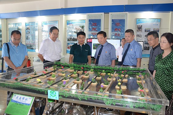 调研组一行在公司展厅滴灌系统模子前相识公司产品应用