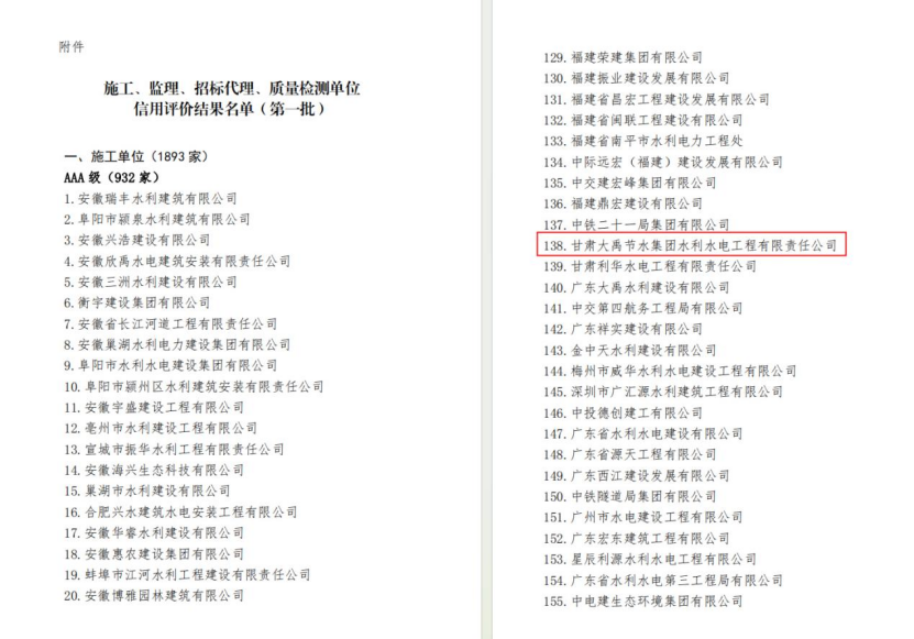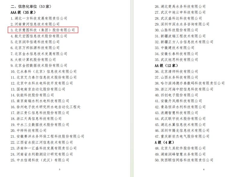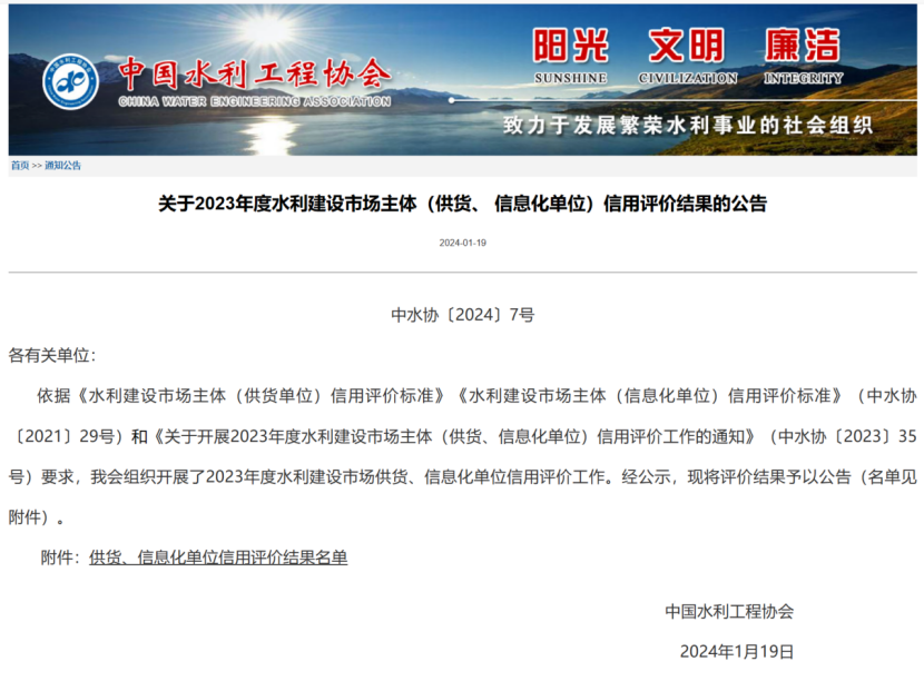 克日,中国水利工程协会、中国水利企业协会宣布了《关于2023年度水利建设市场主体(供货、 信息化单位)信用评价效果的通告》《关于2023年度水利建设市场主体(施工、监理、招标代理、质量检测单位)信用评价效果的通告(第一批)》《关于2023年节水与水处置惩罚企业、智慧水利企业、水利工程白蚁防治机构信用评价效果的公示》,公司供货类、信息化类、施工类、节水与水处置惩罚类四个专业5家公司获得最高信用品级 。