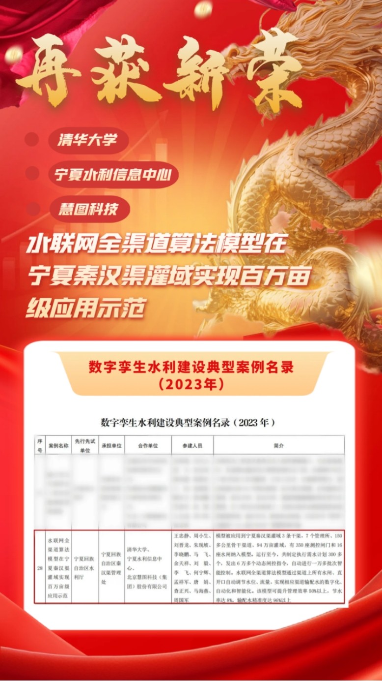 瑞雪兆有年,龙年好运至。日前,水利部宣布“数字孪生水利建设典范案例名录(2023年)公示”,清华大学、宁夏水利信息中心与6t体育慧图科技集团团结参建的课题项目“水联网全渠道算法模子在宁夏秦汉渠灌域实现百万亩级应用树模”入选水利部数字孪生水利建设典范案例名录,被评为典范案例。
