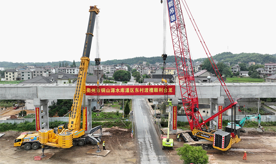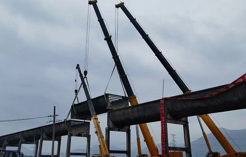 渡槽吊装中由于渡槽跨长达24米,吊索具约5吨,总吊装重量约310吨,最大高度13.1米,长度、重量和高度均超通例。吊装按每一跨分节吊装,凭证吊车吊装参数团结本工程施工条件及施工特点,渡槽槽身吊装以每节槽身为吊装单位举行施工,吊装思量接纳1台350吨履带吊+1台750吨汽车吊抬吊方法吊装。